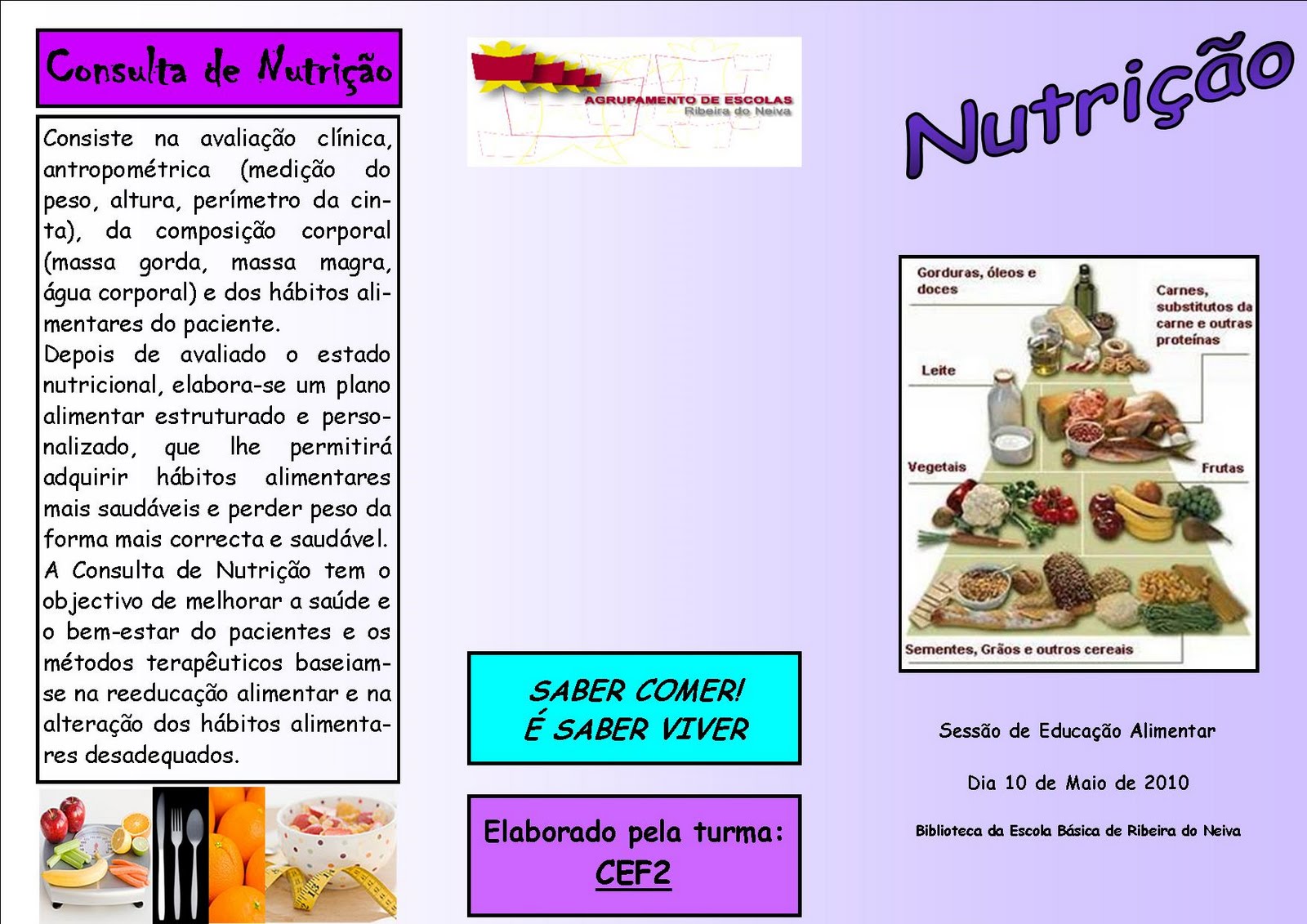 No âmbito do Projecto de Orientação Vocacional desenvolvido pela Dra. Marta Alves, Psicóloga, os/as alunos/as dos Cursos de Educação e Formação (CEF) da Escola Básica de Ribeira do Neiva, participaram, no passado dia 10 de Maio, numa Sessão de Educação Alimentar, realizada pela Nutricionista, Dra. Alexandra Lima, na Biblioteca. Esta actividade teve como objectivo geral a sensibilização para a prática de uma alimentação equilibrada e variada, prevenindo assim o aparecimento de doenças decorrentes das más práticas alimentares e consequentemente promover a qualidade de vida. Neste sentido, deu-se a conhecer a nova roda dos alimentos e discutiram-se hábitos alimentares; incentivou-se ainda a prática de exercício físico e alertou-se para a existência de distúrbios alimentares, comuns na adolescência. Os/as alunos/as participaram de uma forma activa e entusiasta durante a sessão e elaboraram previamente um folheto sobre nutrição e alimentação. No final da sessão existiu um espaço para esclarecimento de dúvidas, logo os/as alunos/as aproveitaram para obter alguns conselhos da profissional da área de Nutrição Clínica.